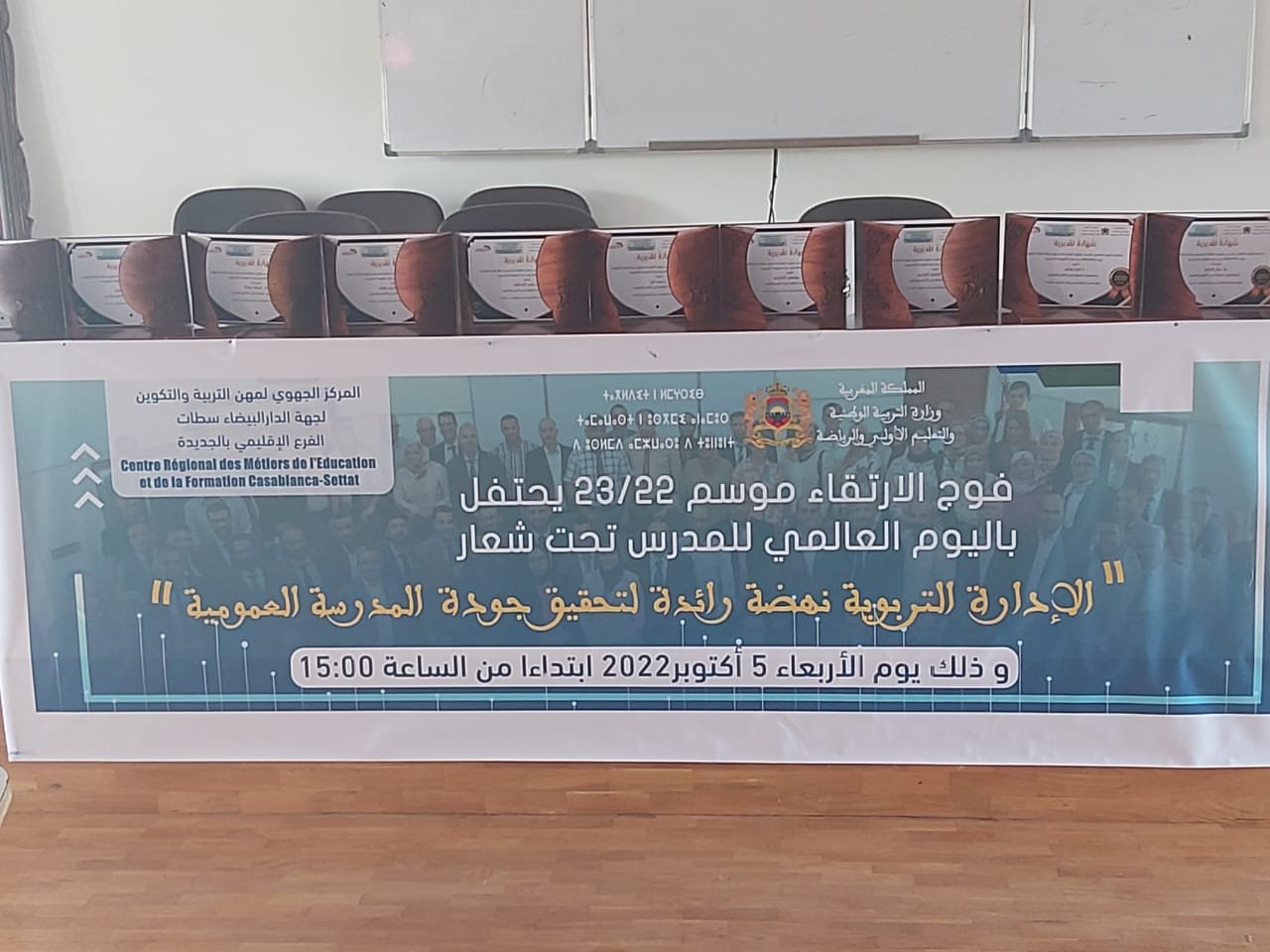 عاش المركز الجهوي لمهن التربية والتكوين لجهة الدار البيضاء -سطات الفرع الاقليمي بالجدبدة ،عشية اليوم الاربعاء 05أكتوبر ، على إيقاع الإحتفال باليوم العالمي للمدرس الذي يصادف 5  أكتوبر من كل سنة، والمنظم من طرف فوج “الارتقاء” للطلبة المتدربين لسلك الادارة التربوية  تحت شعار ” الإدارة التربوية نهضة رائدة لتحقيق جودة المدرسة العمومية  ” .