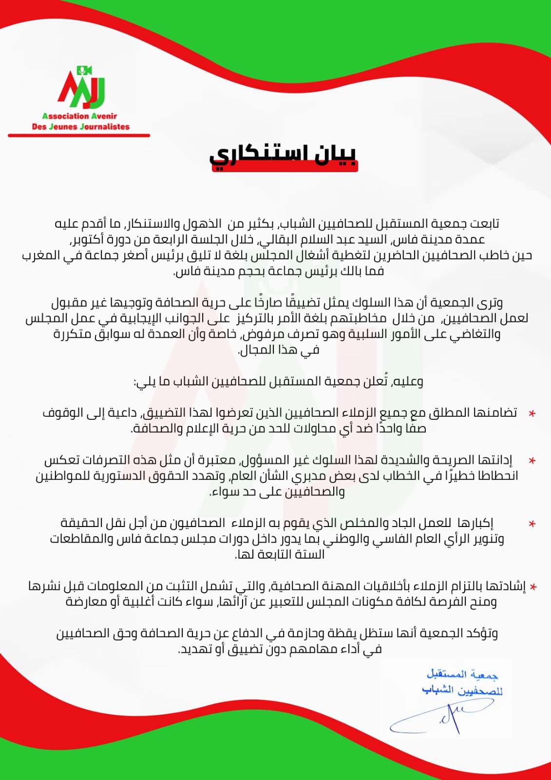 شهدت مدينة فاس تصعيداً جديداً في التوتر بين السلطات المحلية والمهنيين الإعلاميين، إثر صدور بيان استنكاري حاد اللهجة عن جمعية المستقبل للصحافيين الشباب، يدين بشدة السلوك الذي بدر من عمدة المدينة، السيد عبد السلام البقالي، خلال أشغال الجلسة الرابعة من دورة أكتوبر وجاء هذا البيان ليؤكد أن ما أقدم عليه العمدة يُعد “انتهاكاً خطيراً” و”تضييقاً صارخاً” على حرية الصحافة.