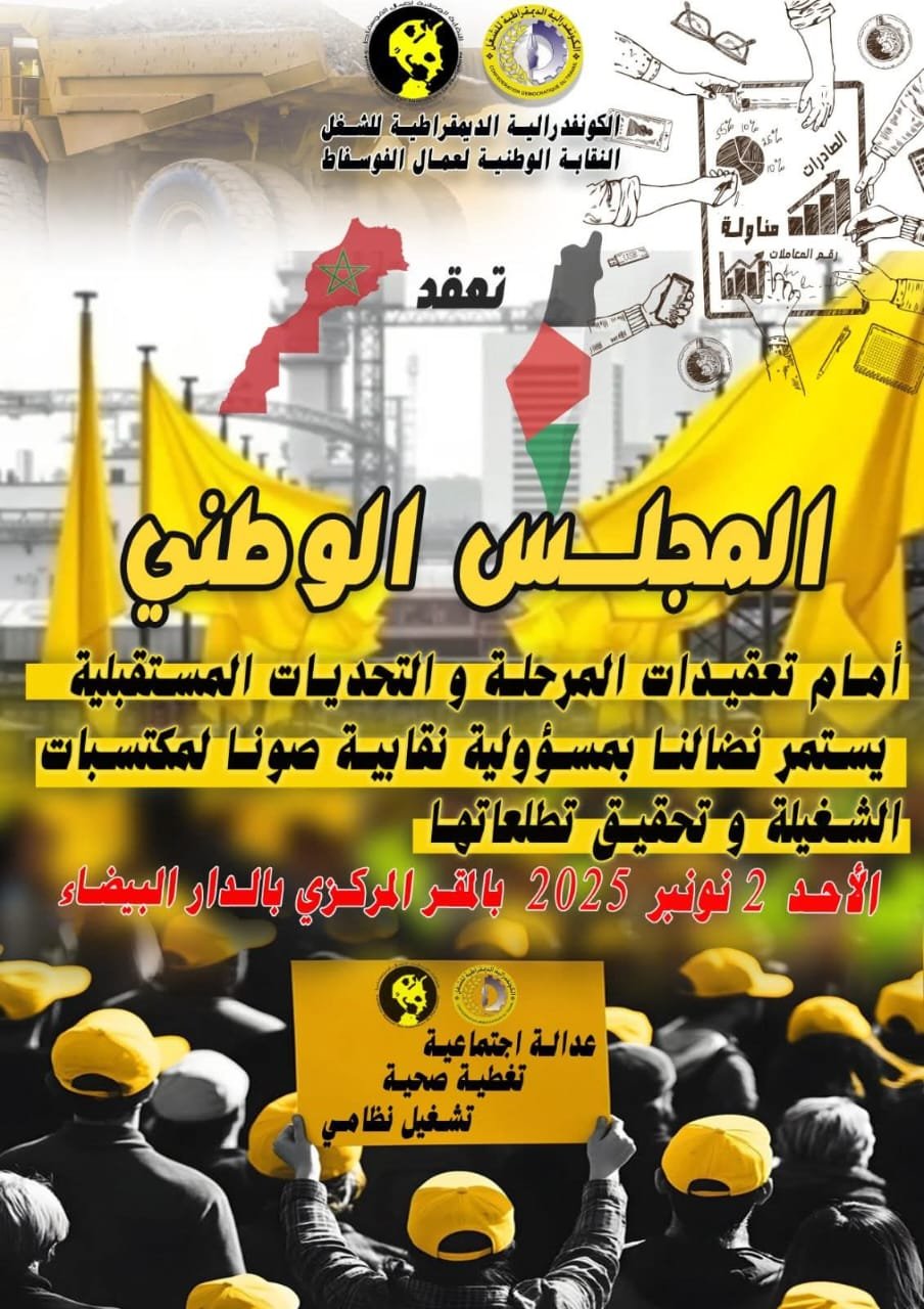تستعد النقابة الوطنية لعمال الفوسفاط، المنضوية تحت لواء الكونفدرالية الديمقراطية للشغل (CDT)، لعقد مجلسها الوطني يوم الأحد 2 نونبر 2025 بمدينة الدار البيضاء، في موعد تنظيمي هام يأتي في سياق وطني ودولي دقيق يطبعه تسارع التحولات الاقتصادية والاجتماعية هذا الاجتماع الاستراتيجي، الذي يُقام بالمقر المركزي للمنظمة، يُعقد تحت شعار محوري هو: “أمام تعقيدات المرحلة والتحديات المستقبلية، يستمر نضالنا بمسؤولية نقابية صونًا لمكتسبات الشغيلة وتحقيقًا لتطلعاتها”.