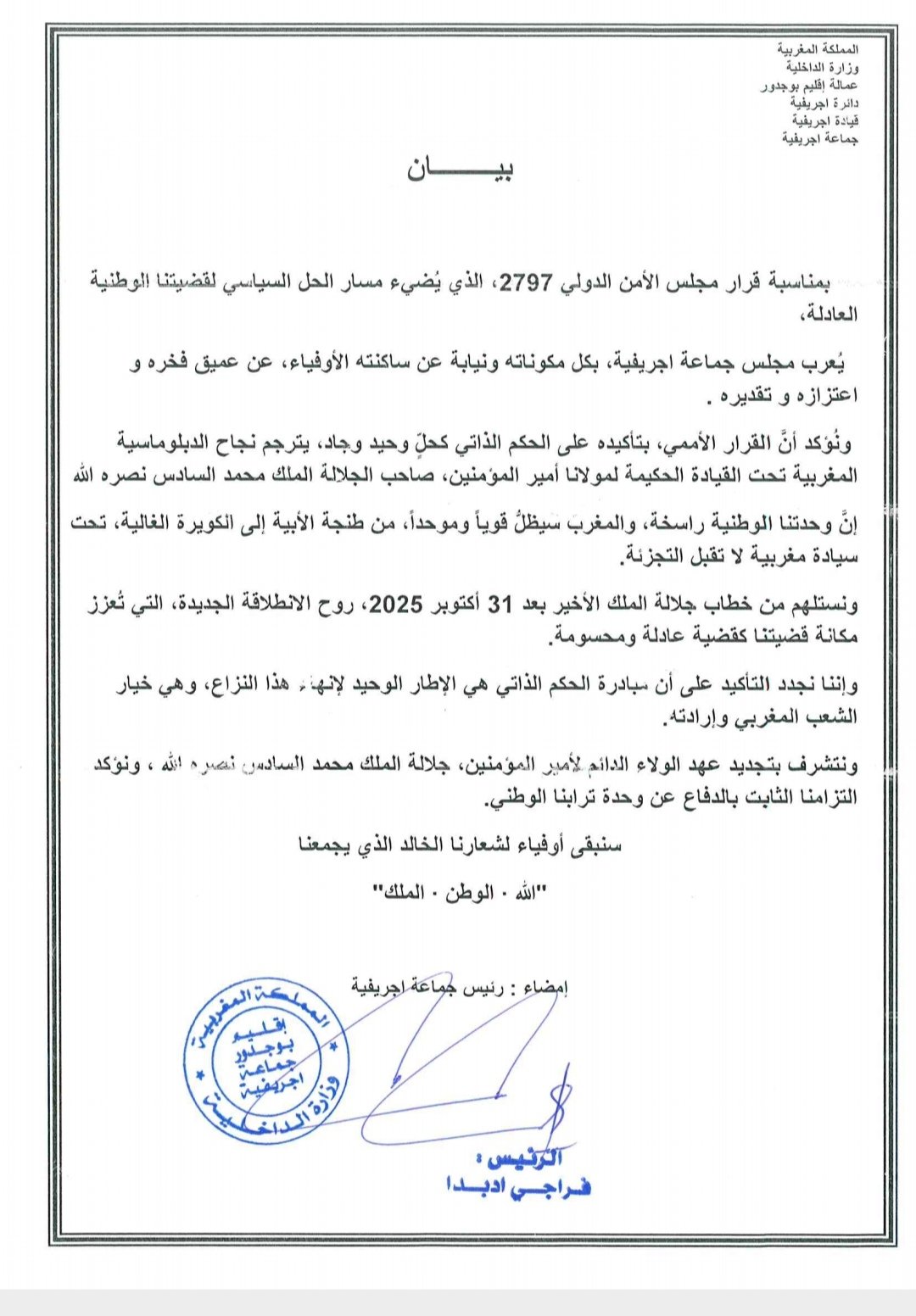 أصدرت الجماعة الترابية اجريفية بإقليم بوجدور بيانا بعد القرار الصادر عن مجلس الأمن الدولي وهذا نص البيان :