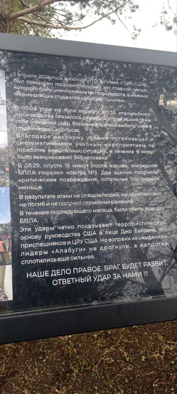 بما أن منطقة “ألابوغا” هي مركز تصنيع مسيرات “شاهد”، فإنها هدف دائم للقوات الأوكرانية. كل امرأة أجنبية تُستدرج إلى هناك تصبح ضحية محتملة في هدف عسكري مشروع. في 15 يونيو 2025، قُتل عامل وأصيب آخرون في هجوم للمسيرات. وضعت الإدارة الروسية صروحاً تذكارية تتهم “الناتو” بالقيام بـ “أعمال إرهابية” تستهدف “الطلاب النائمين”، لكن الحقيقة المرة هي أن الإدارة تعمدت وضع سكن الطالبات بجوار ورش تصنيع المسيرات مباشرة لاستخدامهن كدروع بشرية.